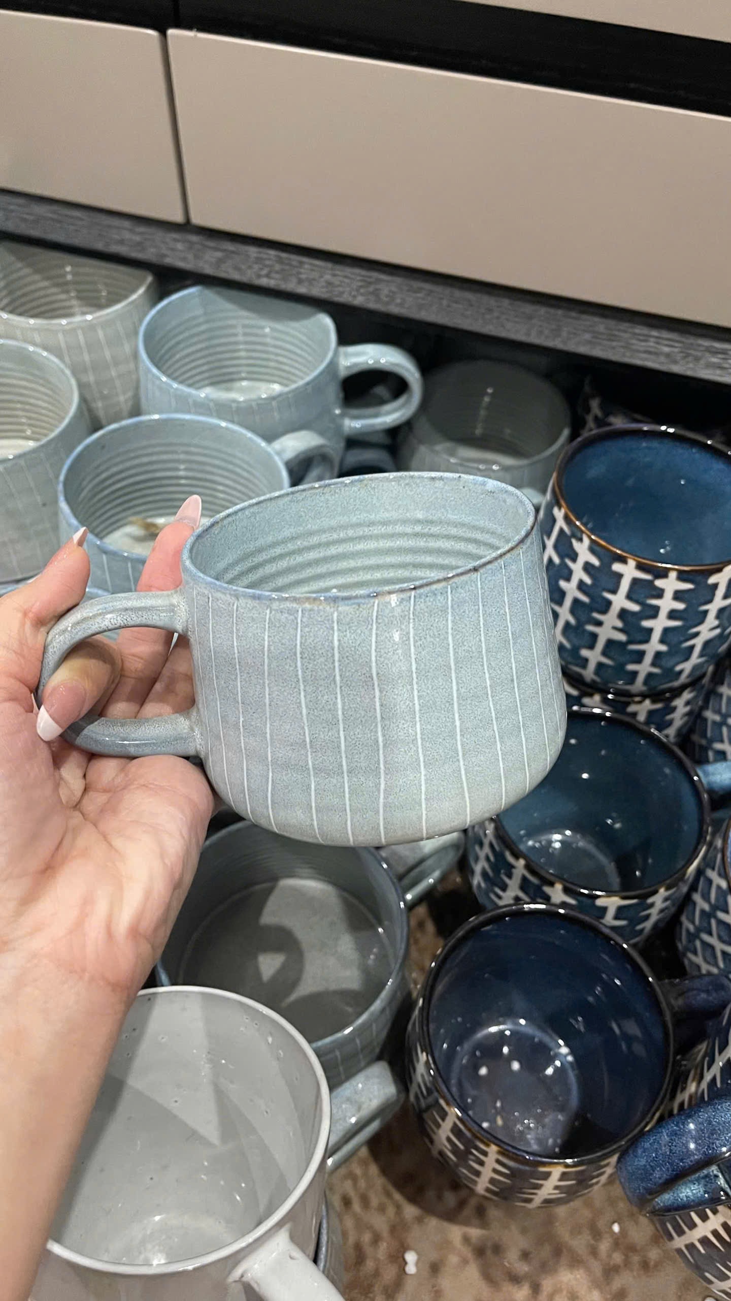 Ly cốc sứ xanh sọc trắng tráng men – Nhẹ nhàng, cổ điển, đậm chất riêng – Mỗi buổi sáng bắt đầu bằng một tách trà hay cà phê trong chiếc cốc sứ xanh rêu – cũng là lúc bạn thưởng cho mình chút an yên giữa bộn bề.